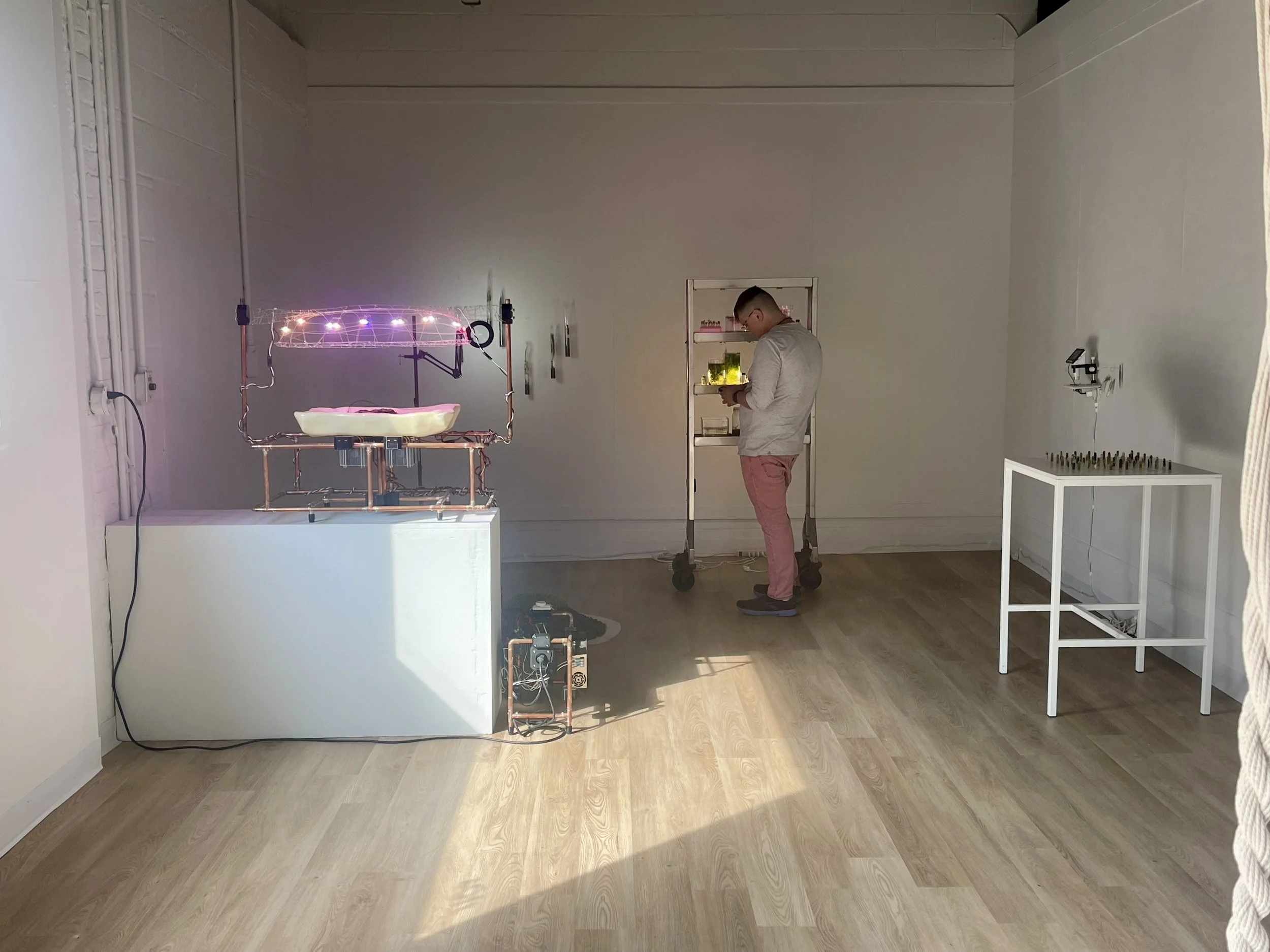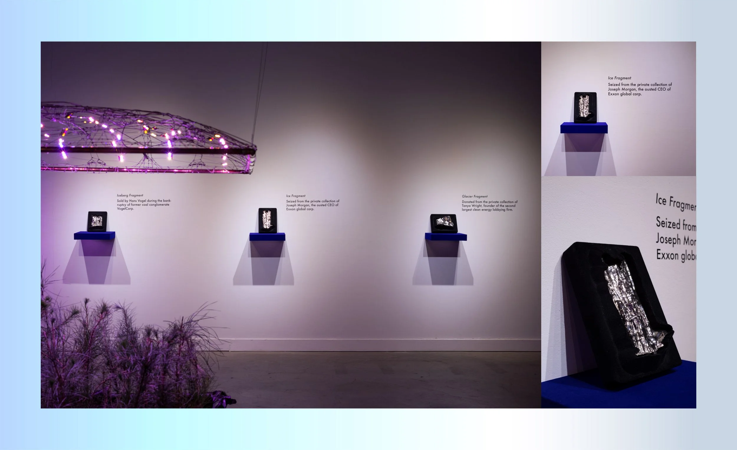 How will we remember glaciers once they are gone? Collected below are some devices that imagine that future precisely. In the museums of the future, all we may have is a 3D scan to remember the icy giants from the before times. These devices contain multiple methods of refrigeration to bring the aluminum cast of various glaciers to freezing. Water from the air condensates on their frigid surface and frost over. On a timescale of ~30 minutes, these glaciers freeze and thaw, dripping their valuable water into a collection tray.