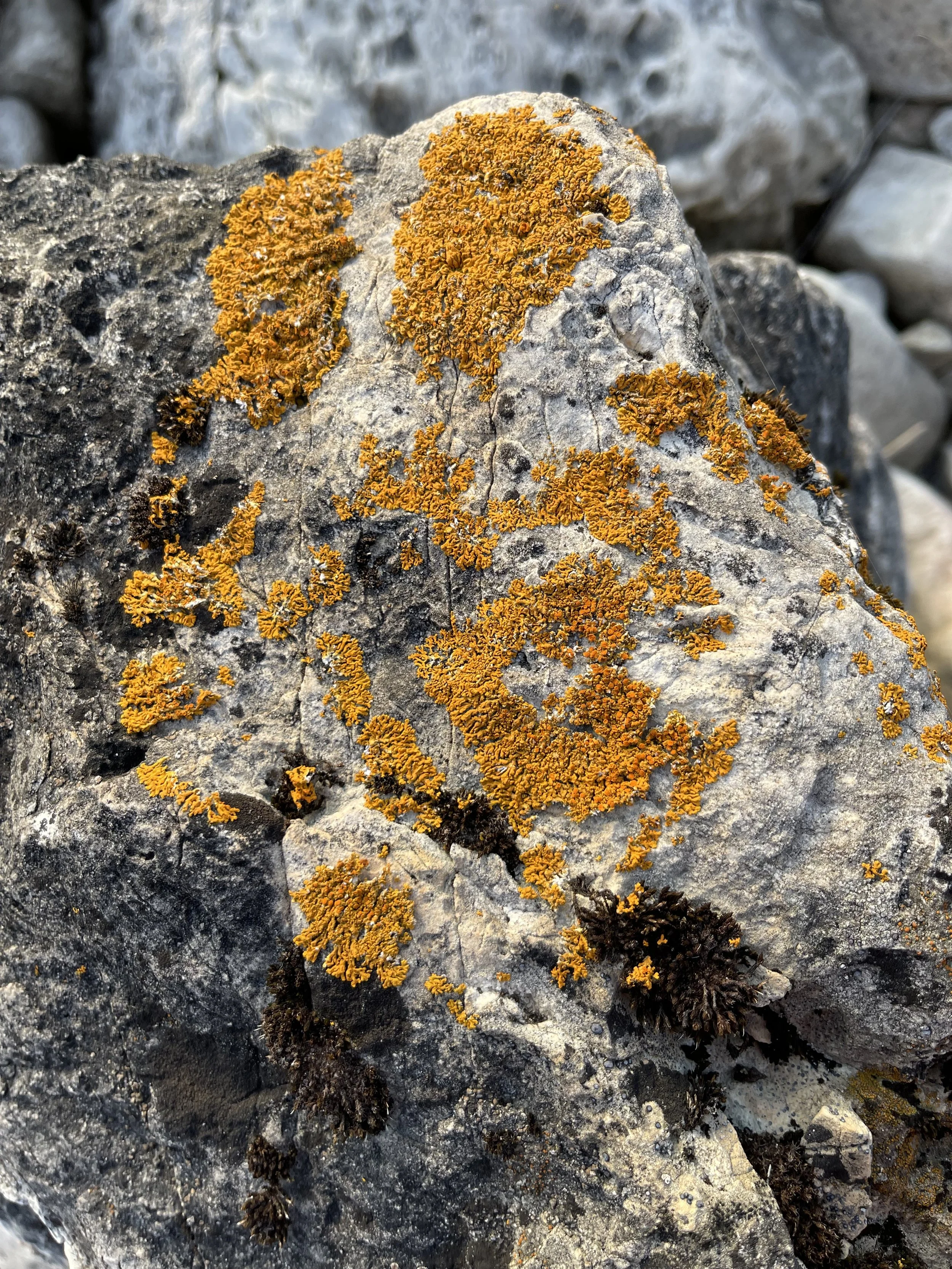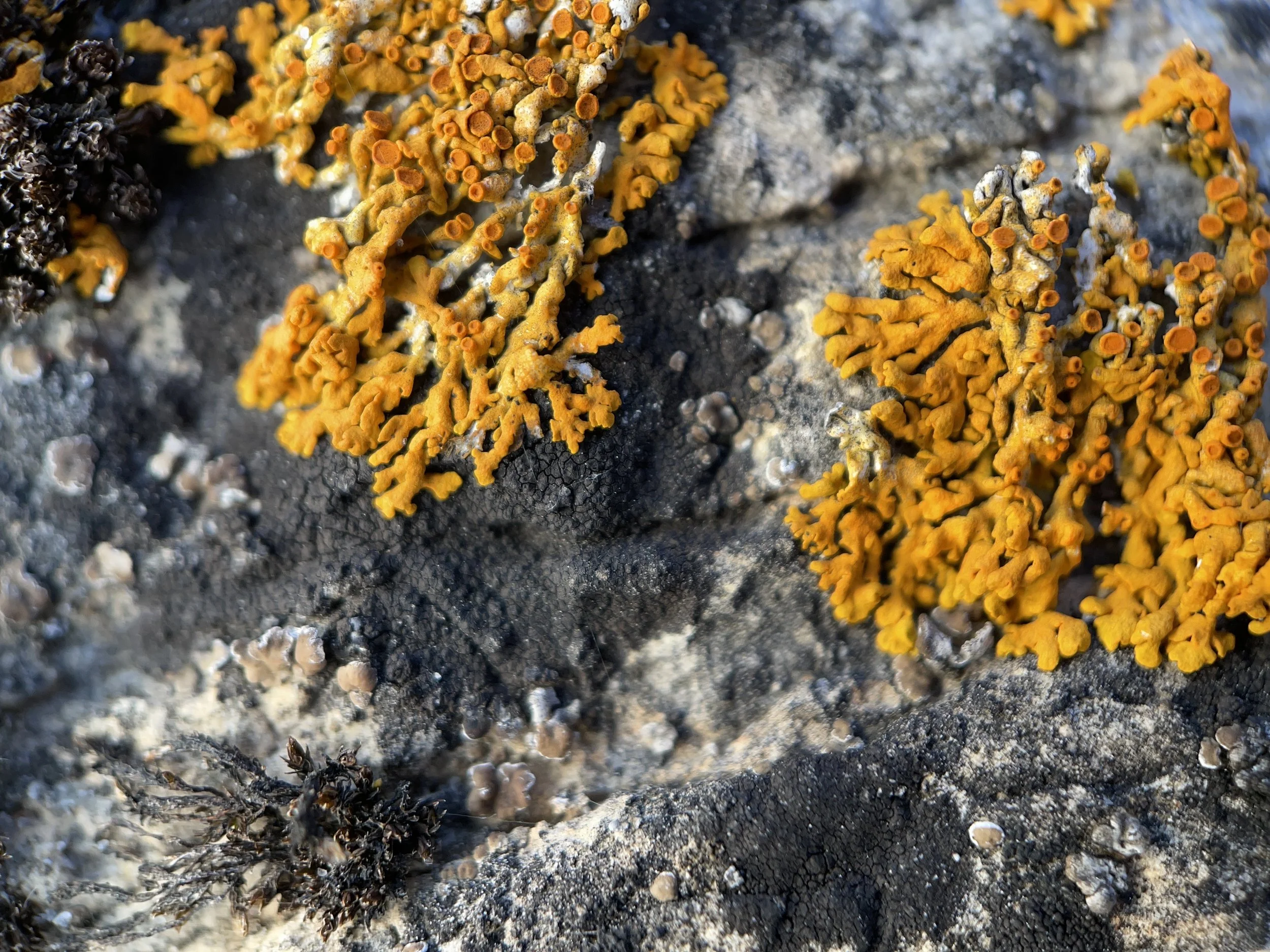 Rhizocarpon geographicum (map lichen) and Rusavskia elegans (elegant sunburst lichen) often grow in the most extreme and remote environments. Their distinctive hues and growth patterns make them particularly identifiable in their harsh habitats. Both lichens have been found to grow in the high alpine and arctic regions around the world. They also have the unique title of being able to survive in outer space, as a 2008 experiment, Expose-E, performed at the International Space Station (ISS) proved. Despite being able to survive in outer space, they do not respond well to pollution. The sunburst used to grow along the shores of Lake Erie, but it has not been spotted there reliably since the 1960s. These specimens were collected in the Rocky Mountains of Colorado and are growing in a vessel that regulates the soil temperature to a few degrees above zero Celsius.