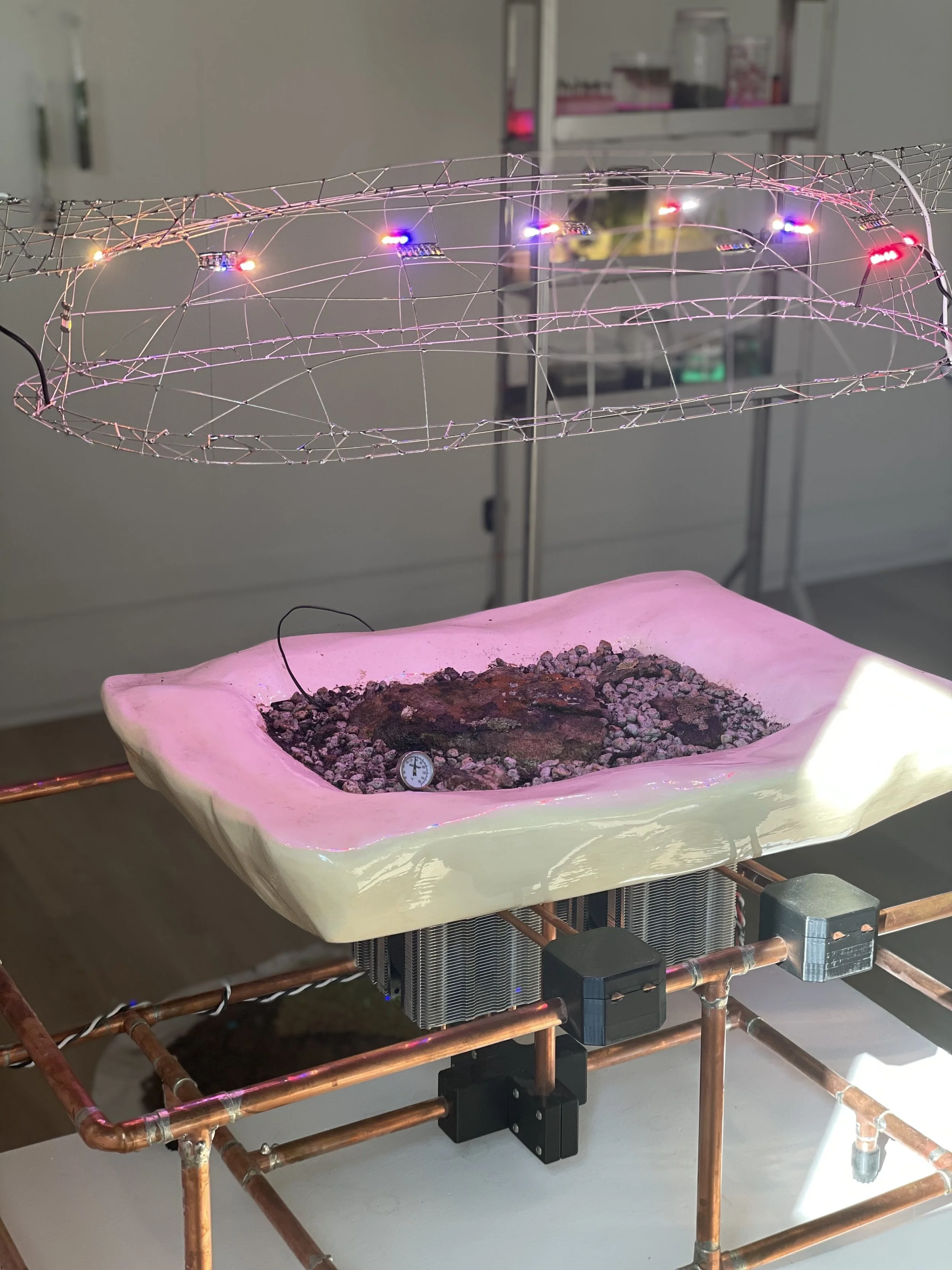 Saxifrage opppositifolia is a low-growing plant found in arctic and alpine regions. It does not adapt well to change and consequently will be at risk of extinction if global temperatures rise. This specimen was collected from Juneau, Alaska, in August 2022 and is growing in a vessel that regulates the soil temperature to a few degrees above zero Celsius. Habitats like this may be necessary in the future if carbon emissions are not reduced.